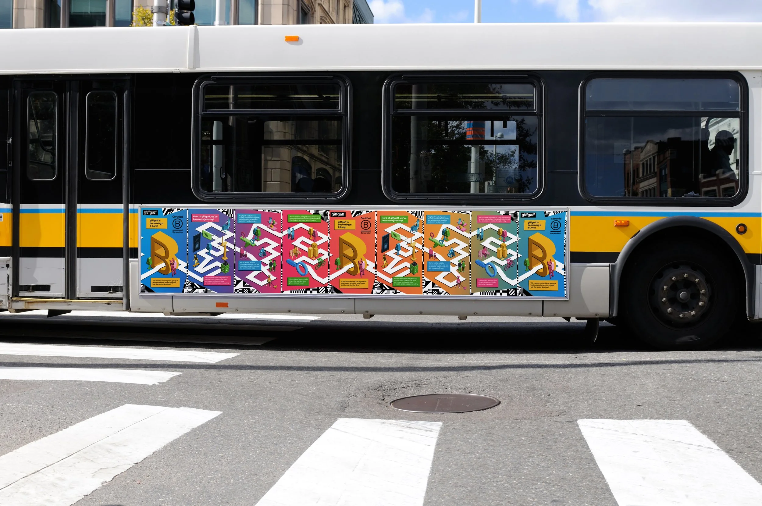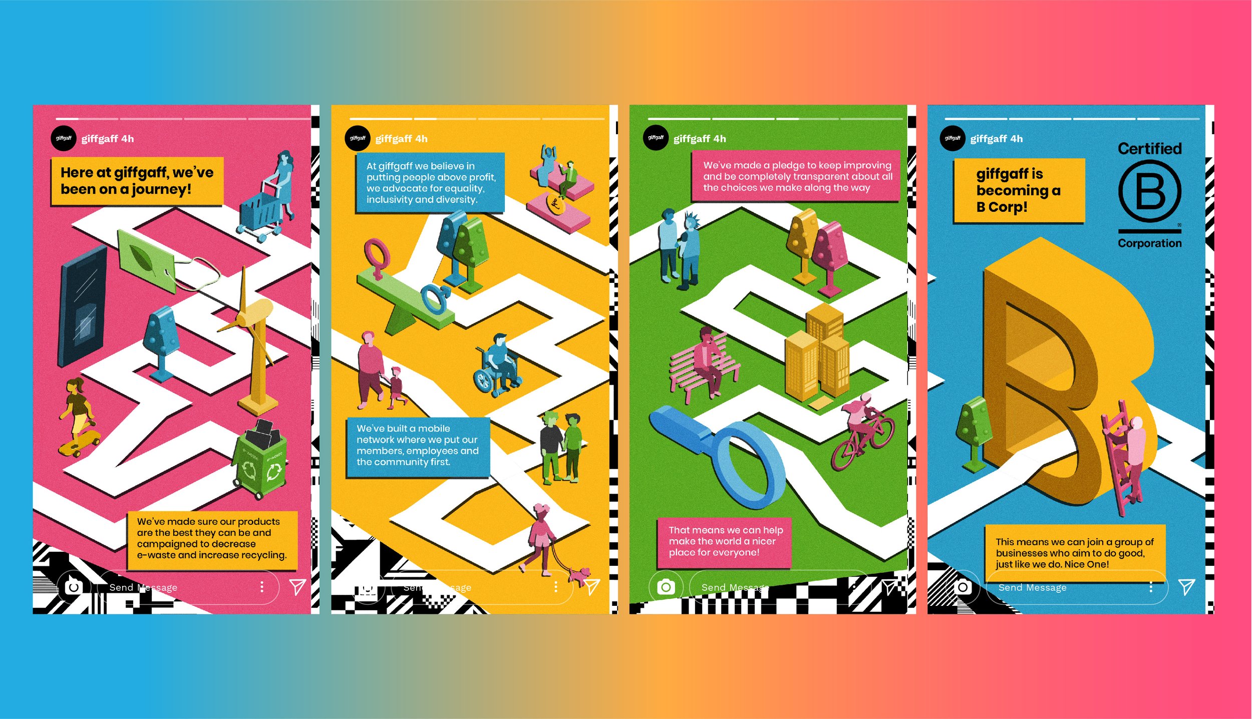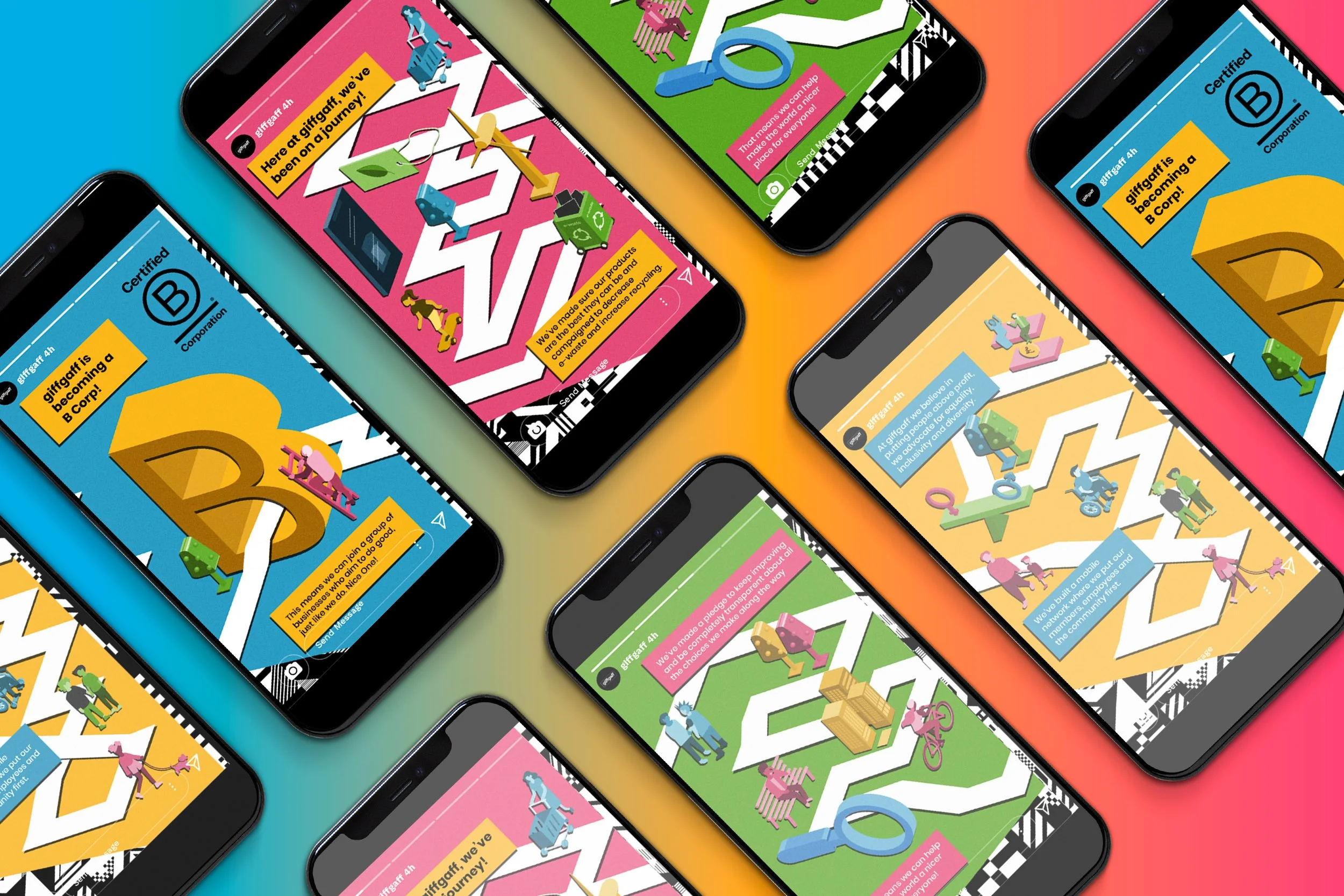 This project was created for a university brief and submitted to the 2023 D&AD New Blood Awards. As a fan of giffgaff’s ethical and community-first approach, I was excited to work on a campaign celebrating their milestone of becoming a certified B Corp. The brief asked for Instagram Story assets and Out Of Home (OOH) activations to share this achievement. After researching giffgaff and B Corp values, I developed a modular concept using isometric flat illustrations to tell the story of their journey, designed to work across both digital and physical platforms.