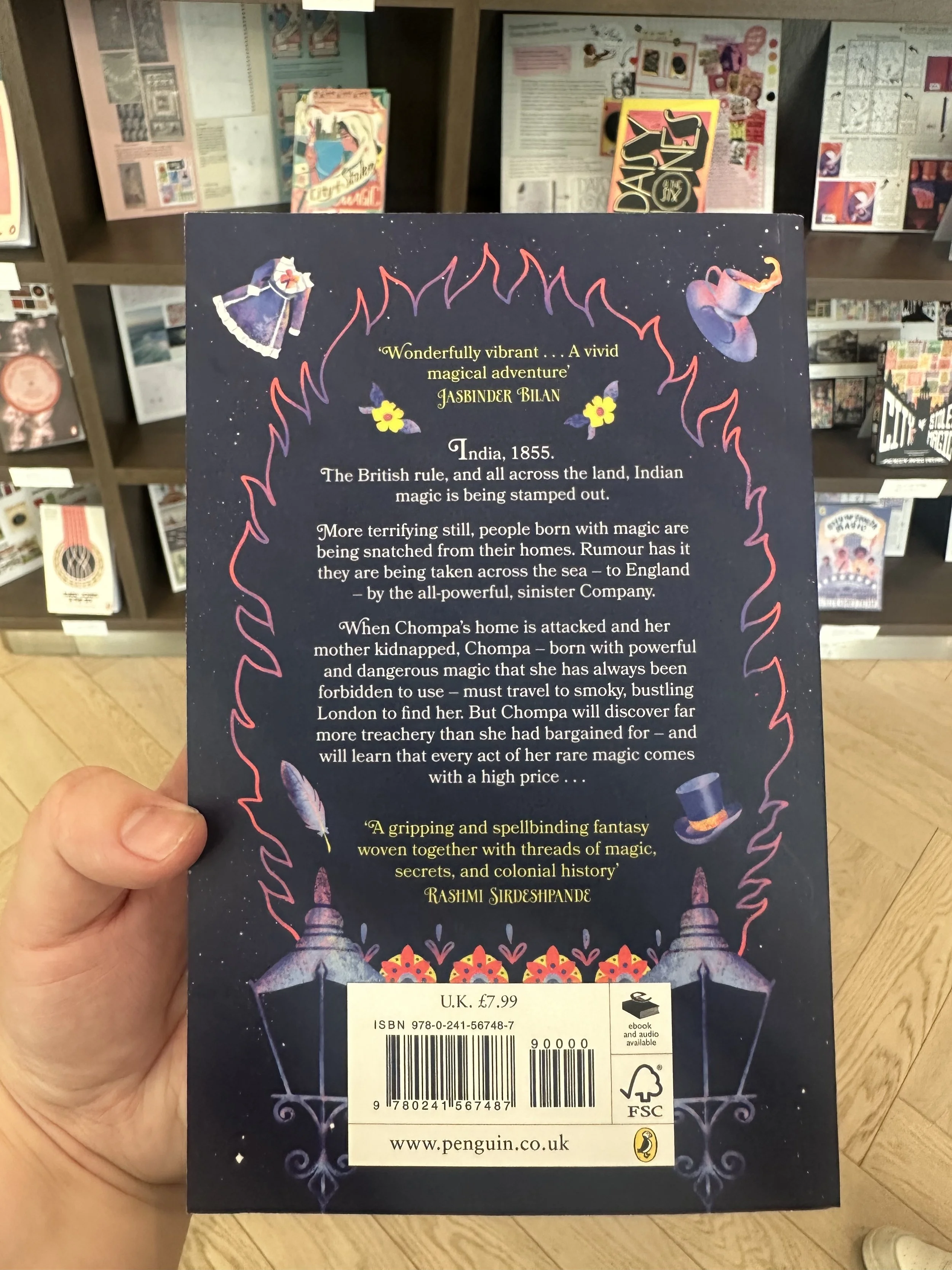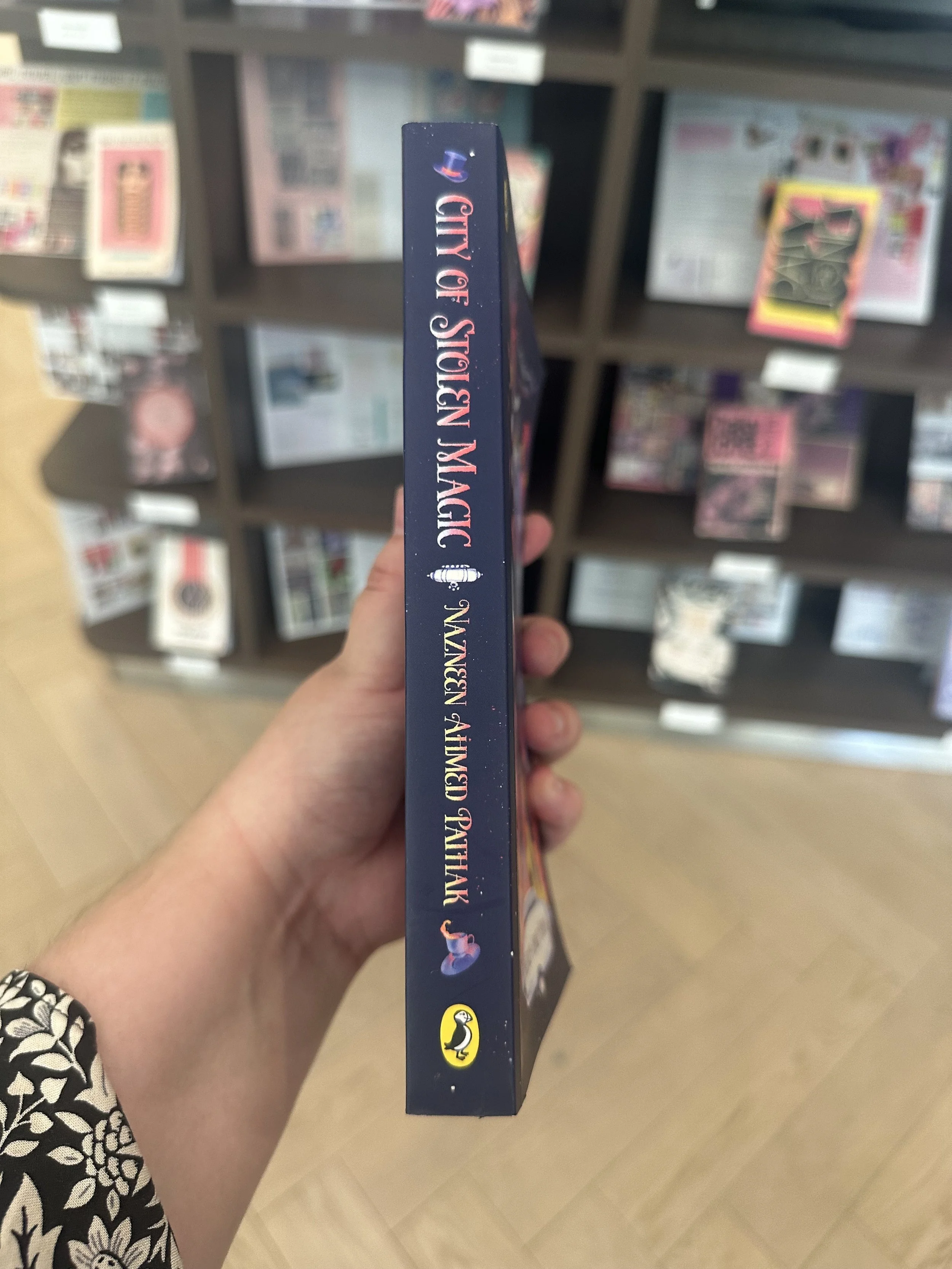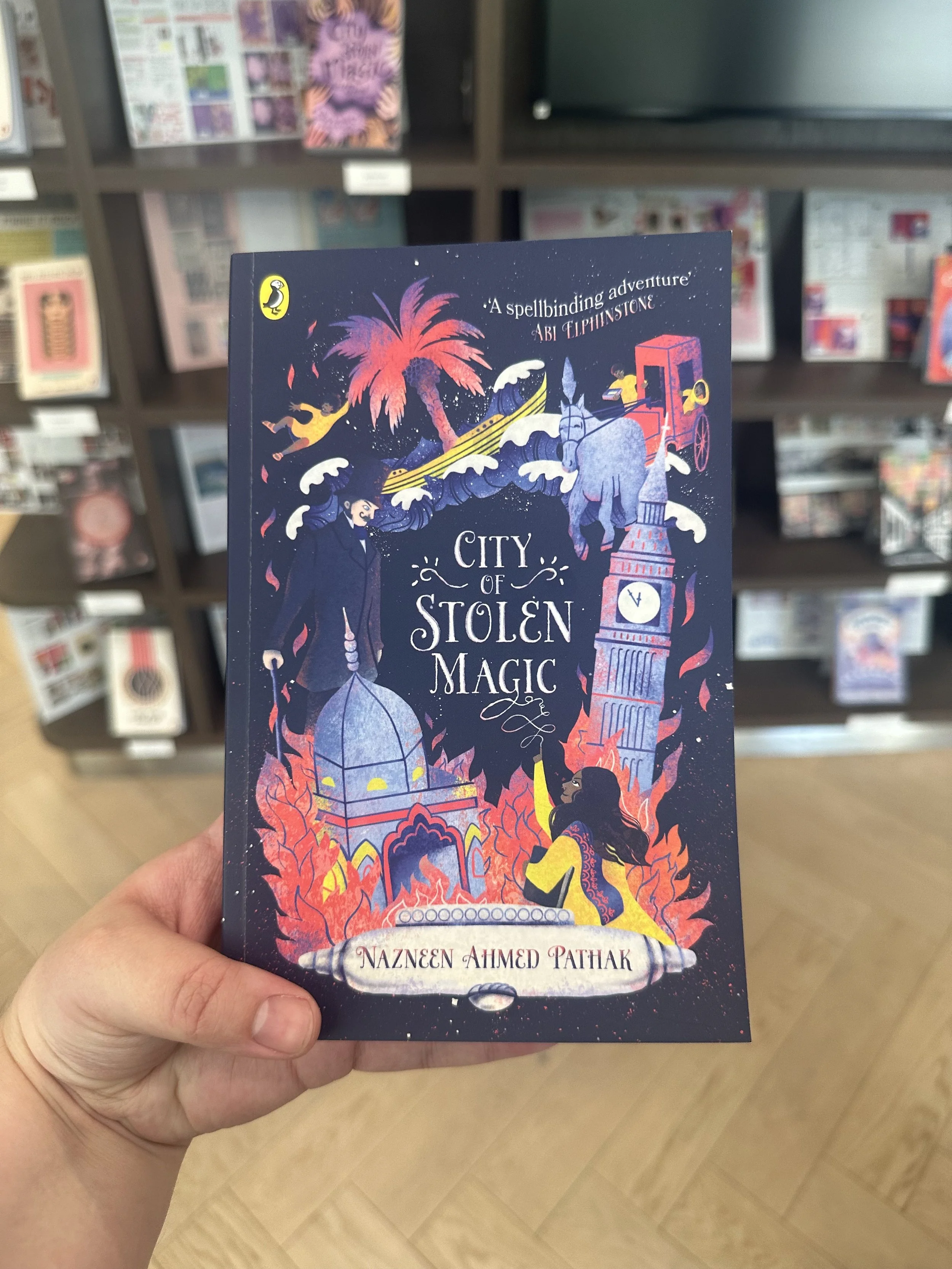 The book cover for 'City of Stolen Magic' by Nazneen Ahmed Pathak. The cover features a  reaching out, surrounded by flames, with iconic landmarks like Big Ben in flames and a flying horse, set against a starry night sky with whimsical illustrations of a man in a coat, a flying teapot, a girl in a dress, and a magician's top hat.